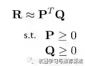 相乘的形式,这些方法的共同之处是,即使原始矩阵的元素都是非负的,也不能保证分解出的小矩阵都为非负,这就导致了推荐系统中经典的矩阵分解方法可以达到很好的预测性能,但不能做出像User-based CF那样符合人们习惯的推荐解释(即跟你品味相似的人也购买了此商品)。在数学意义上,分解出的结果是正是负都没关系,只要保证还原后的矩阵元素非负并且误差尽可能小即可,但负值元素往往在现实世界中是没有任何意义的。比如图像数据中不可能存在是负数的像素值,因为取值在0~255之间;在统计文档的词频时,负值也是无法进行解释的。因此提出带有非负约束的矩阵分解是对于传统的矩阵分解无法进行科学解释做出的一个尝试。它的公式如下: