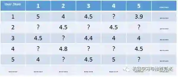 对于评分预测任务来说,我们通常将用户和项目(以电影为例)表示为二维矩阵的形式,其中矩阵中的某个元素表示对应用户对于相应项目的评分,1-5分表示喜欢的程度逐渐增加,?表示没有过评分记录。推荐系统评分预测任务可看做是一个矩阵补全(Matrix Completion)的任务,即基于矩阵中已有的数据(observed data)来填补矩阵中没有产生过记录的元素(unobserved data)。值得注意的是,这个矩阵是非常稀疏的(Sparse),稀疏度一般能达到90%以上,因此如何根据极少的观测数据来较准确的预测未观测数据一直以来都是推荐系统领域的关键问题。