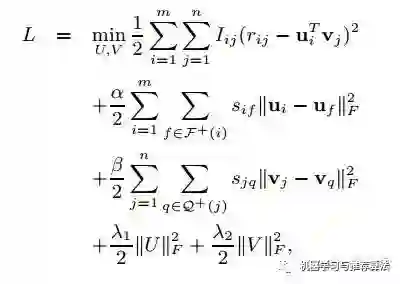 虽然经典的矩阵分解方法已经可以到达比较好的预测性能了,但它固有的弊病仍然是躲不开的,即数据稀疏与冷启动问题。为了缓解数据稀疏我们可以引入丰富的社交信息。即如果两个用户是朋友关系,那么我们假设他们有相同的偏好,同时他们学得的用户隐表示在向量空间应该有相近的距离。用户维度如此,同理,项目维度亦可以利用此思路来约束项目隐表示。即如果两个项目之间的关系较近,那么在低维向量空间中的距离同样也应该较小。这里的项目关系是从UI矩阵中抽取出来的,论文中成为项目隐社交关系(其实项目维度跟社交没啥关系)。具体公式如下: