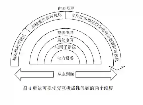 物理电网跨域广、设备多、运行情况多样,这些特点就造成了电网中存在数据量庞大、数据交互频繁、数据更新快等问题。在完成孪生电网的建模后,这些问题就会给孪生电网的可视化交互分析带来挑战。应该如何设计可视化分析与交互的方案,从而使得孪生电网能更好地赋能电网企业的决策、执行、运营等环节;应该如何保证可视化技术能够良好响应,从而体现孪生电网的实时性、准确性,体现数字孪生电网可视化相比较于传统电网仿真技术的优势。工业4.0研究院就数字孪生电网的发展问题给出1.0-3.0的演进过程[61],即从“DTL1(Digital Twin Level 1)的几何形状”到“DTL2引入GIS(Geographic Information System)等数据”再到“DTL3全面采用点云驱动”。基于此演进过程,在可视化方面,数字孪生电网可以从两个维度解决这些问题,如图4所示:首先,如何从点到面,从单一的电力设备到电网中的简单子系统,从子系统再到局部电网,从局部电网到整体电网;其次,如何由表及里,从基础形状可视化到高精度仿真可视化,再到多尺度多维度的全电网动态数据可视化。