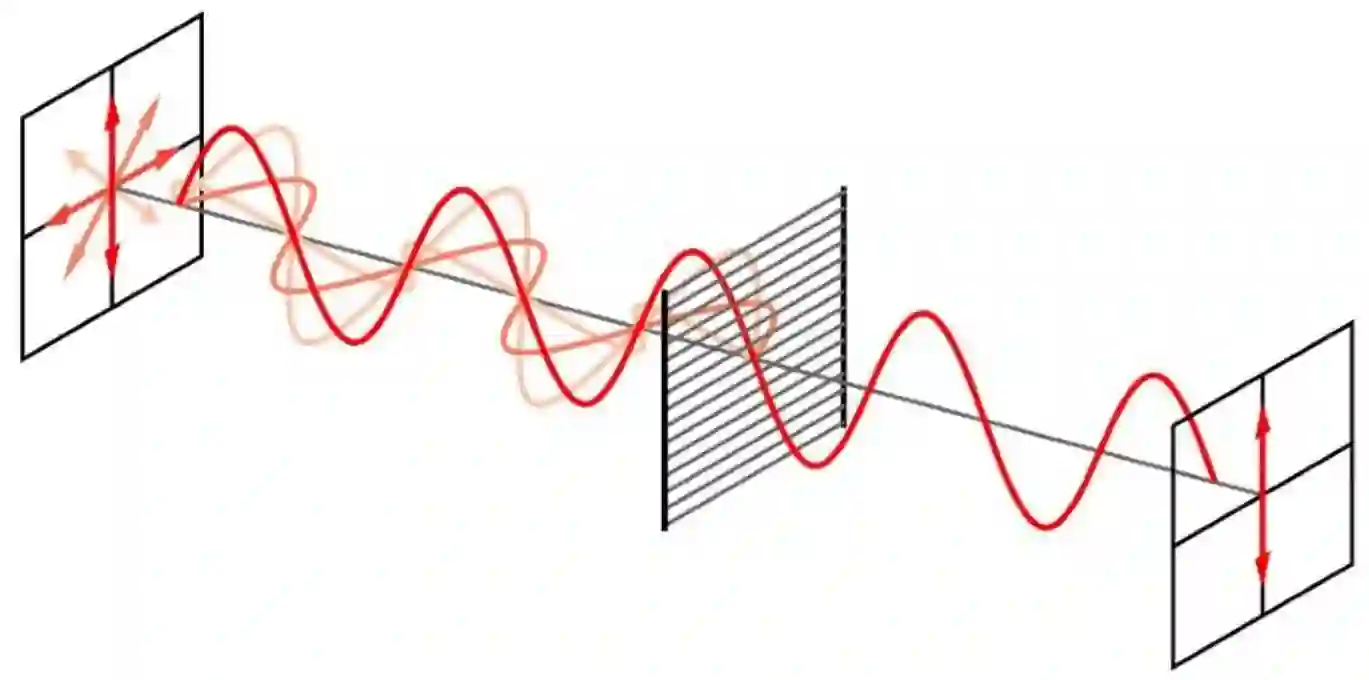 线偏振器将非偏振光变成一束单一的线偏振光,所有波的垂直分量透射,而水平分量被吸收和反射。