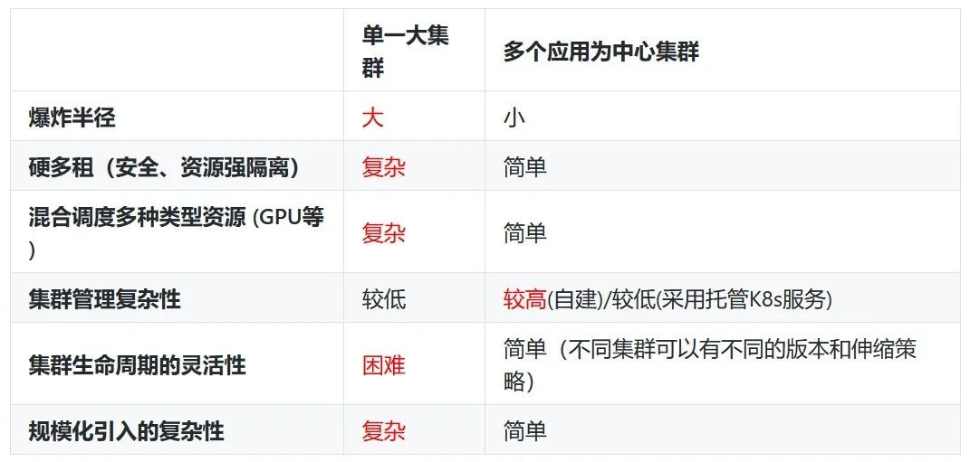 在用户反馈中,采用以多个小集群的主要原因在于爆炸半径比较小,可以有效提升系统的可用性。同时通过集群也可以比较好地进行资源隔离。管理、运维复杂性的增加是采用多个小集群的一个不足之处,但是在公共云上利用托管的 K8s 服务(比如阿里云的 ACK)创建和管理 K8s 集群生命周期非常简单,可以有效解决这个问题。