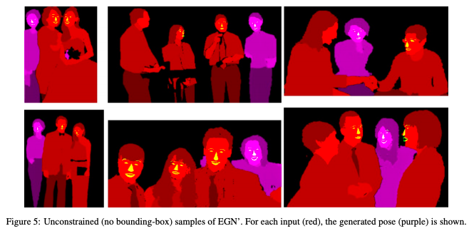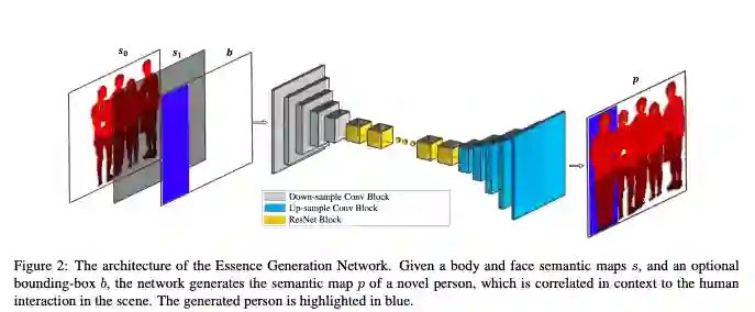 EGN主要用来捕捉图像中的人与人之间的互动,并提供一种连贯的方式将新人加入图像。它创建的语义图能表示背景,头发,脸部,躯干,上肢,上身穿着,下半身穿着,下肢和鞋子等,并且与现有人员的环境相适应。此外,EGN还支持使用自定义轮廓来指定新加入人员的大小和位置。