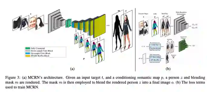 至于MCRN,它会学习如何将现实人物渲染并融合到图像中以创建新图像,并以可自定义的方式嵌入目标人物的外观属性(例如衬衫,裤子和头发的颜色)。