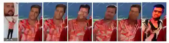 「Wish You Were Here」的效果图,只需要单张静态图片,系统就能自动调整要人物的姿势和面部表情嵌入到目标图片中。