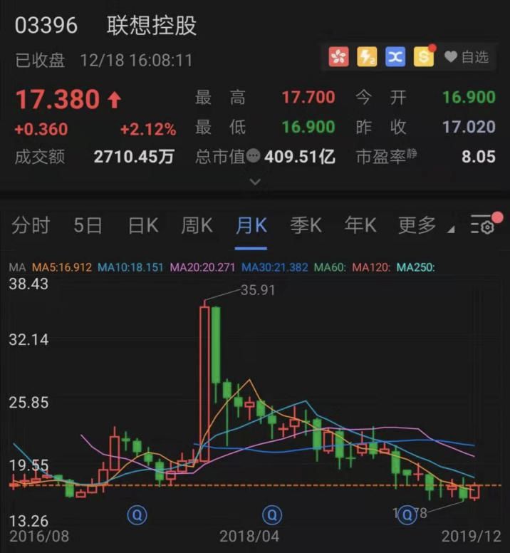 2018全年,联想控股实现收入3589.20亿元,净利润为43.62亿元。2019年上半年,联想控股营收1793. 11 亿元,净利润26. 65 亿元。截至12月18日收盘,联想控股在港股的总市值为409.51亿港元。