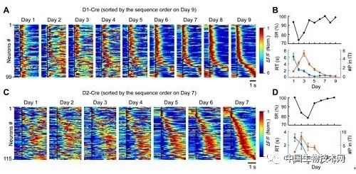 图2.直接通路和间接通路群体神经元的顺序性电活动伴随着学习逐渐产生:(A)直接通路和(C)间接通路的同一群神经元在小鼠学习过程中的电活动模式图(所有天均按照最后1天的神经元平均ΔF/F峰值时间排序,按照黑线标出的推杆运动的起始时刻来对齐)。(B,D) 与(A) 图和(B)图数据分别对应的小鼠在任务学习中的行为学表现。