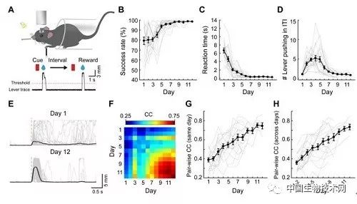 图1.小鼠推杆运动学习任务范式的建立:(A) 小鼠推杆行为范式。头部固定的小鼠被训练在声音信号的提示下,在规定的试验时间里推动一根活动杆。成功的推杆会获得水作为奖励。(B-D) 伴随着学习,小鼠的成功率逐步上升至平台期,反应时间逐渐下降,在试验间隔内的平均推杆次数经历了先上升后下降的过程。(E-H) 小鼠的推杆轨迹伴随着学习从杂乱变得整齐。