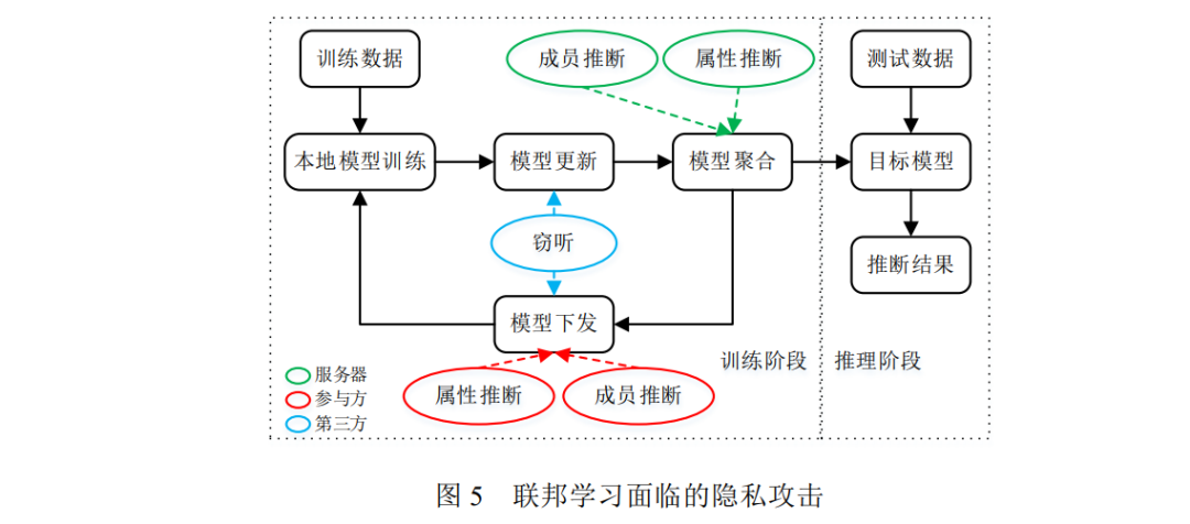 虽然联邦学习通过参与方和服务器交换模型参数的方式保护了参与方的本地数据,但是学者研究发现交 换的模型梯度也可能泄露训练数据的隐私信息[109,110].对于集中学习,模型倒推(model inversion)攻击可以从模 型中反推训练数据的属性值[111],这同样也适用于联邦学习的全局模型.而联邦学习的训练机制也为隐私引入了 新的风险: (1) 联邦学习的模型信息对攻击者是可见的,攻击者可以实施白盒隐私攻击. (2) 联邦学习的训练包含多轮迭代,攻击者可以利用模型在迭代过程的变化挖掘更多的数据信息. (3) 攻击者可以通过参与方或服务器干扰模型训练过程,修改模型参数,使正常参与方在后续迭代中暴露 更多本地数据信息. 因此许多学者专门针对联邦学习存在的隐私风险与保护方法进行研究.本文以联邦学习面临的隐私攻击 的发生逻辑和顺序对目前主要研究的攻击手段进行分类(如图 5 所示),具体分为成员推断攻击[112–115]、属性推 断攻击[16,112,116–122]和窃听.根据攻击者角色的不同,隐私攻击发生在联邦学习的不同阶段,如服务器是在模型聚 合阶段发动隐私攻击.注意,在图 5 的推理阶段可以实施集中学习的隐私攻击手段,这部分不在本文讨论范围内.