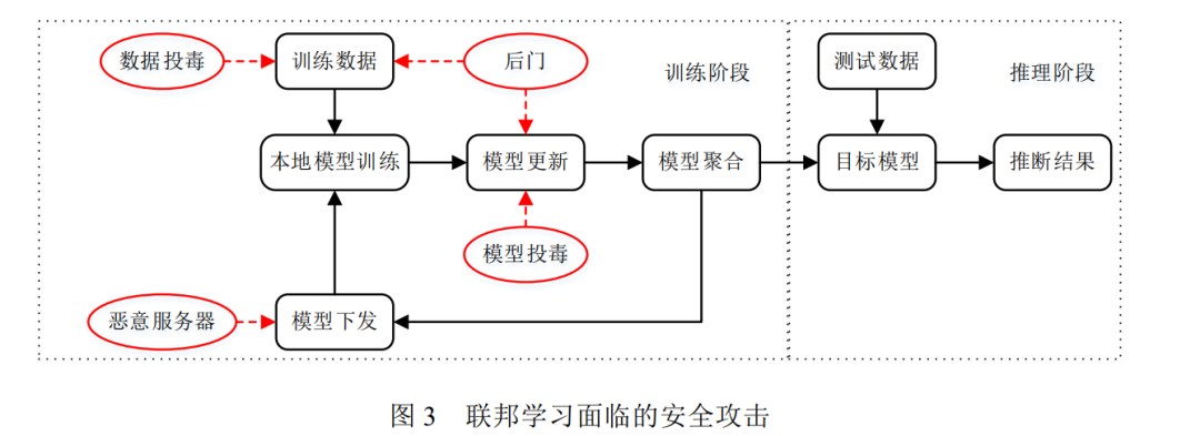 在集中学习的发展过程中,许多学者对其安全性进行深入研究,发现其中存在的安全威胁,如训练阶段的投 毒攻击(poisoning attack) [19]和推理阶段的对抗样本攻击(adversarial examples attack)等[20].联邦学习的推理阶段 与集中学习一致,因此也会面临对抗样本攻击.而在训练阶段,联邦学习采用分布式计算的方法,为整个系统的 安全性研究引入了新的问题与挑战.本文主要总结面向联邦学习的安全威胁与防护方法,与集中学习相关的安 全研究不在本文的讨论范围内.
