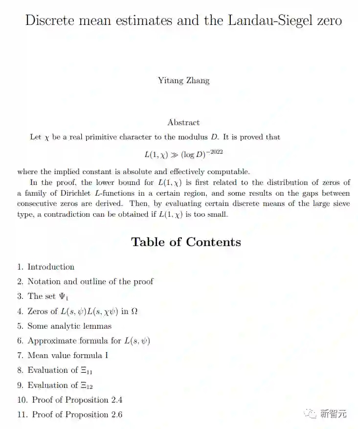 目前,解决这个零点猜想问题的111页的完整版预印本论文「Discrete mean estimates and the Landau-Siegel zero」已经可以下载。