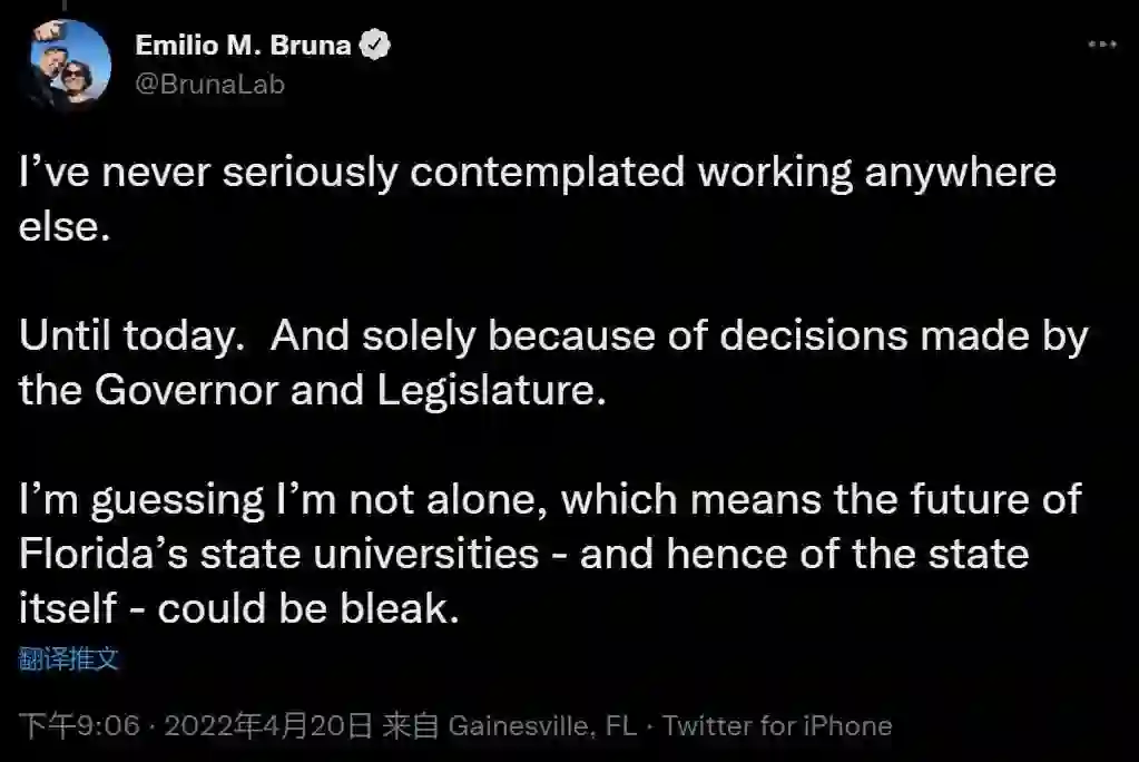 「直到今天以前,我从来没有认真考虑过在其他地方工作(但现在开始考虑了)。这完全是因为州长和立法部门做出的决定造成的,」佛罗里达大学热带生态学和拉丁美洲研究教授 Emilio Bruna 在社交网络上写道。「我猜我并不孤单,这意味着佛罗里达州立大学的未来——以及该州本身的未来——可能是黯淡的。」