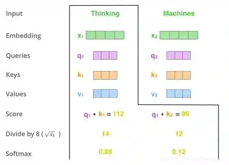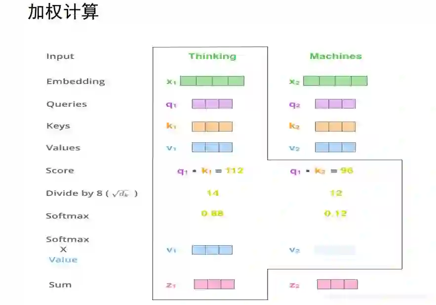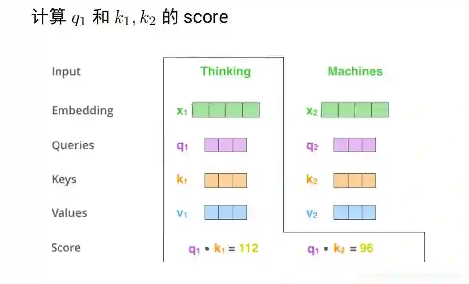 得到向量之后就可以进行编码了,考虑上下文,如上文提到的bank同时有多个语义,编码这个词的时候要考虑到其他的词,具体的计算是q1 k1做内积 q2 k2 做内积得到score,内积越大,表示约相似,softmax进行变成概率。花0.88的概率注意Thinking,0.12注意macheins这个词