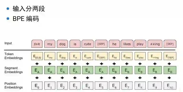 bert的输入是两个句子,分割符sep,cls表示开始,对输入的两个句子,使用位置编码, segment embeding 根据这个可以知道 该词属于哪个句子,学习会更加简单。可以很清楚知道第一句子需要编码什么信息,第二个句子可以编码什么信息。