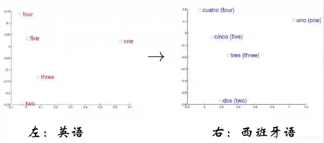 如上图英语和西班牙语映射到语义空间,语义相同的数字他们在语义空间分布的位置是相同的