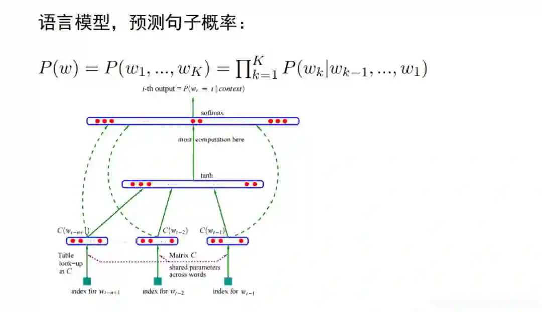 我们都知道word2vec,glove。其实更早之前的神经网络语言模型里出现。已经有比较早的一个词向量了。语言模型是nlp的一个基本任务,是给定一个句子w,包括k个词,我们需要计算这个句子的概率。使用分解成条件概率乘积的形式。变成条件概率的计算。