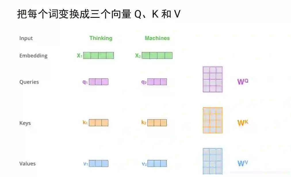 q表示为了编码自己去查询其他的词,k表示被查询,v表示这个词的真正语义,经过变换就变成真正的包含上下文的信息,普通attention可以理解为self-attention的一个特例,
