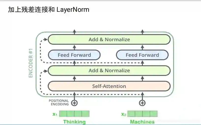 如下图例子给定两个词 thinking和machies,首先通过word embedding把它变成向量,通过self-attention,把它变成一个向量,这里的sefl-attention时考虑上下文的。然后再接全连接层,计算z1的时候我要依赖x1 、x2 、x3整个序列的,才能算z1,z2也一样,我算r1的时候时不需要z2的,只要有z1我就可以算r1.只要有z2就能算r2,这个是比较大的一个区别,这样就可以并行计算。