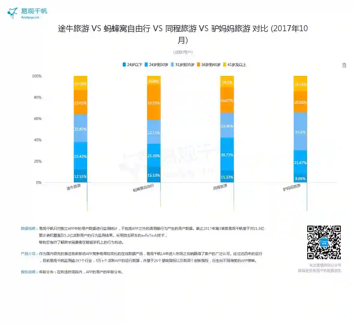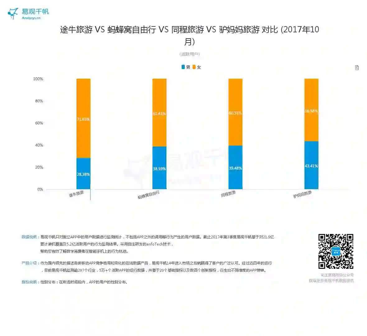 性别上看,四家厂商均为女性用户偏多。途牛旅游更是以71.61%的女性用户比例成为“女性化”最明显的厂商。