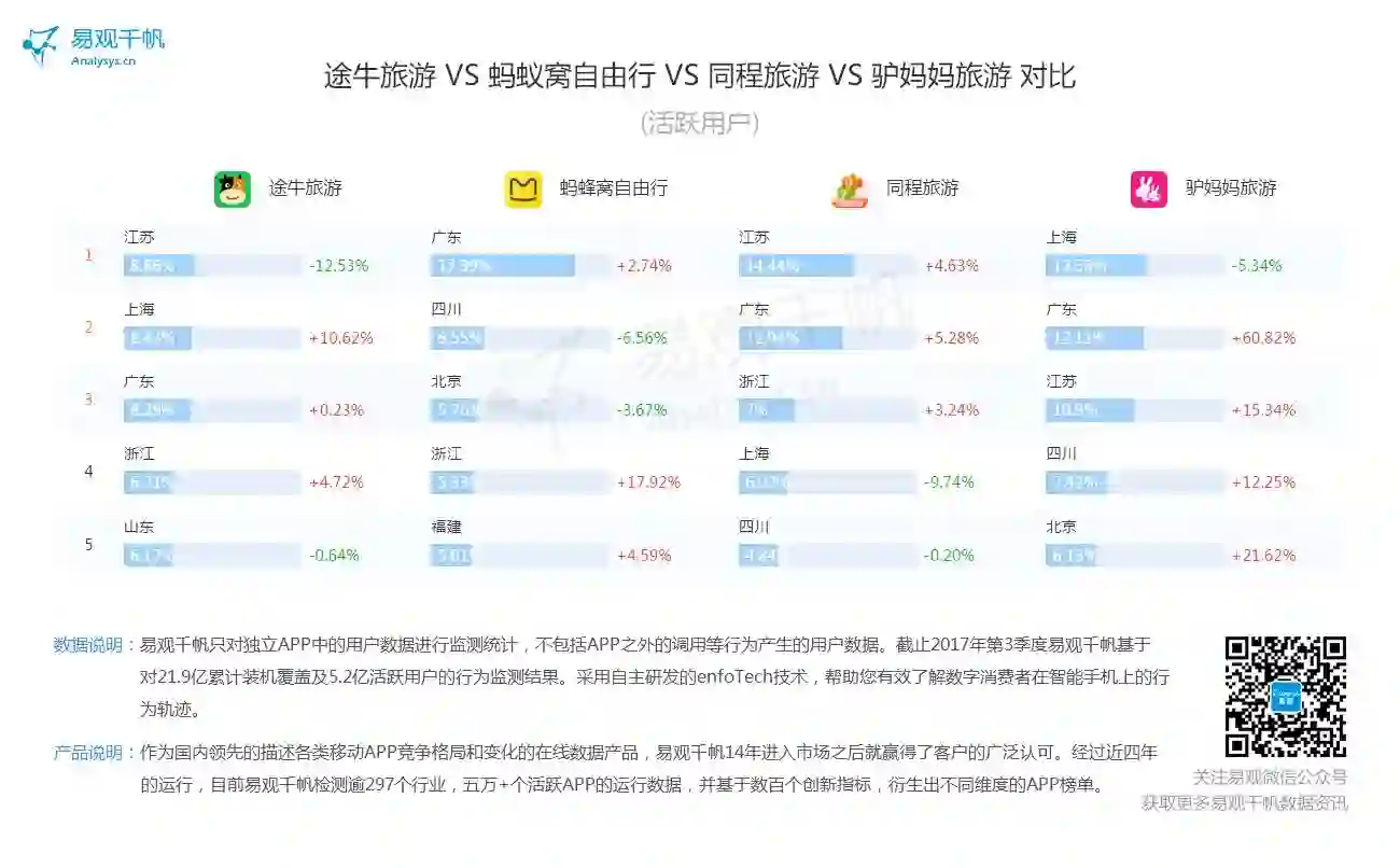 地域上,从省份活跃用户占比维度来看,江苏省霸占了两家头部厂商的头把交椅。其占比分别达到了8.86%、14.44%。驴妈妈的第一名归属其大本营上海市,占比达到12.58%,同时其超一线城市覆盖北上广,略胜其他厂商。广东省攻下蚂蜂窝自由行的桥头堡,以17.99%成为第一大户。总体来看,长三角区域用户占比最高。