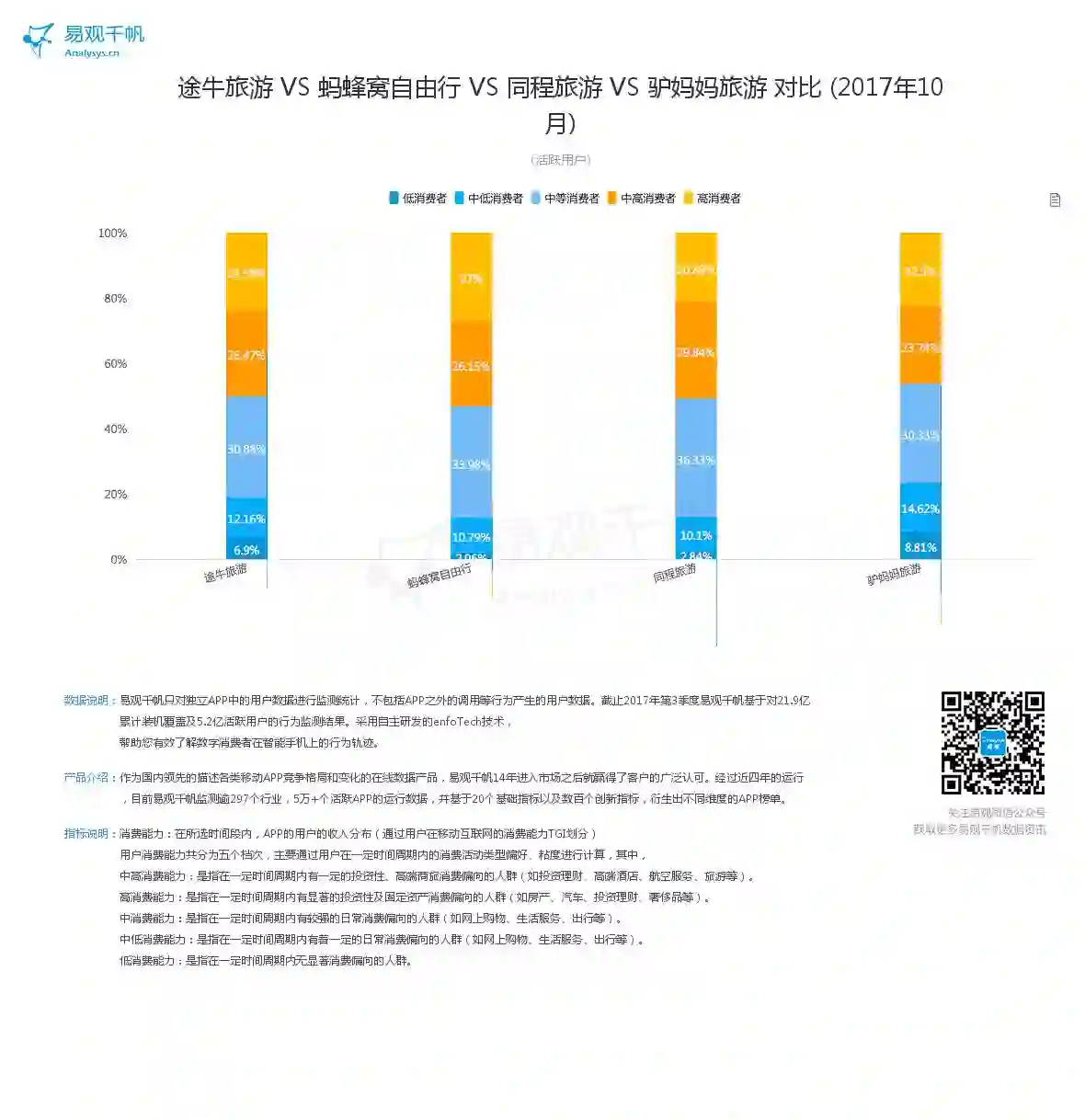 但从人群消费能力来看,头部厂商的消费人群有明显分界线,即以中等消费能力人群为界,中等以上(含中等)人群占80%以上,中低和低消费者只占不到20%。具体来讲,驴妈妈中等以上(含中等)消费者比例最高,达到53.67%。途牛也达到了49.94%。