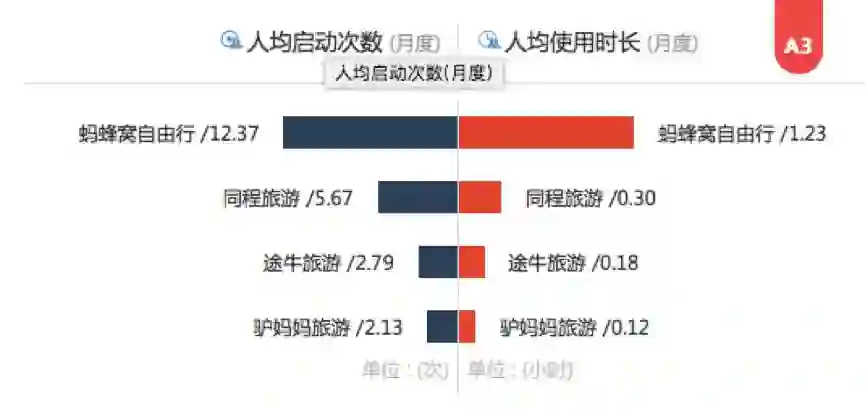 从人均使用频次来看,座次再次重排。蚂蜂窝自由行,同程旅游,途牛旅游和驴妈妈旅游分列第一至第四位。其中,蚂蜂窝自由行在人均启动次数和人均使用时长指标上都大幅领先其它三家厂商,主要是因为蚂蜂窝的UGC属性,用户更习惯使用蚂蜂窝自由行来查看旅游攻略以作为出游决策参考。
