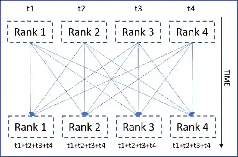 All-reduce 是一种同步通信方式,所有的 ranks 都被执行了一个 reduction 运算,并且得到的结果对所有的 ranks 都是可见的。下图介绍了这个思想(将求和作为 reduction 运算)。