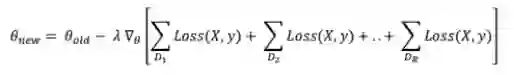 同步 SGD 所依赖的核心技巧是将更新规则中的求和在更小的 (mini)batch 子集上进行分割。D 被分割成 R 个子集 D₁, D₂, . .(推荐每个子集具有相同数量的样本),所以 将标准的 SGD 更新公式中的求和进行分割,得到:
