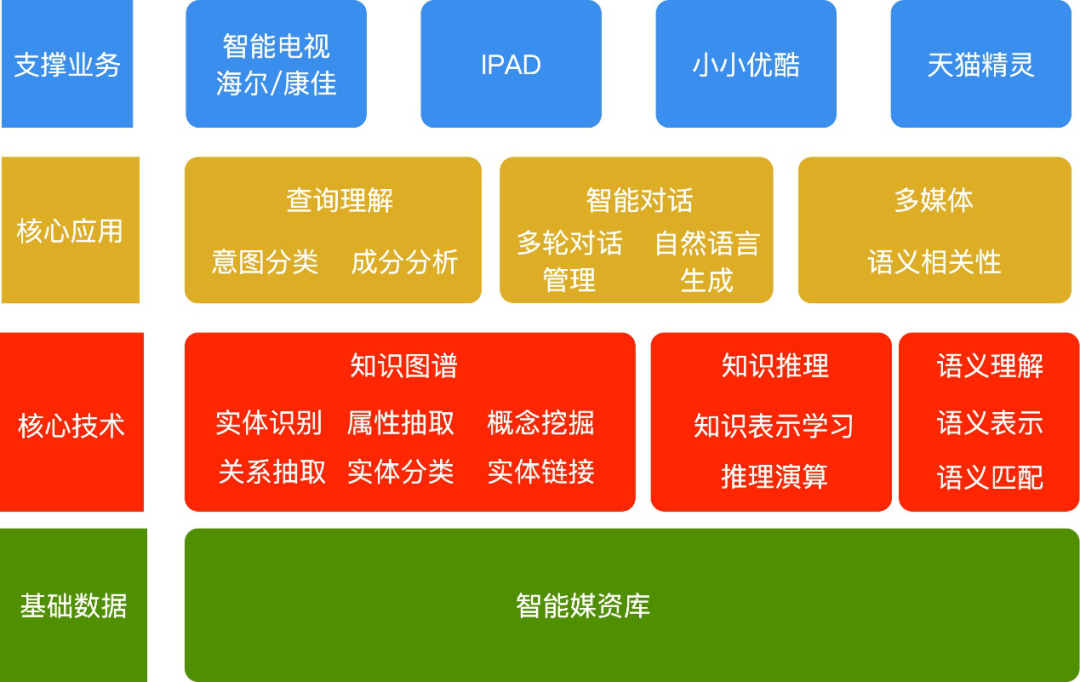交互式搜索系统采用模块化的设计思路,按照分层逻辑结构,分为应用技术层、核心技术层和基础数据层。应用技术层主要包括是自然语言理解(NLU)和对话技术,其中 NLU 包括意图理解(Intent Understanding)技术和成分分析((Slot Filling)技术;对话技术包括对话管理(DM)以及对话生成(NLG)。核心技术层包括知识图谱(Knowledge Graph)的构建和推理应用。基础数据层是基于视觉技术的智能媒资库。