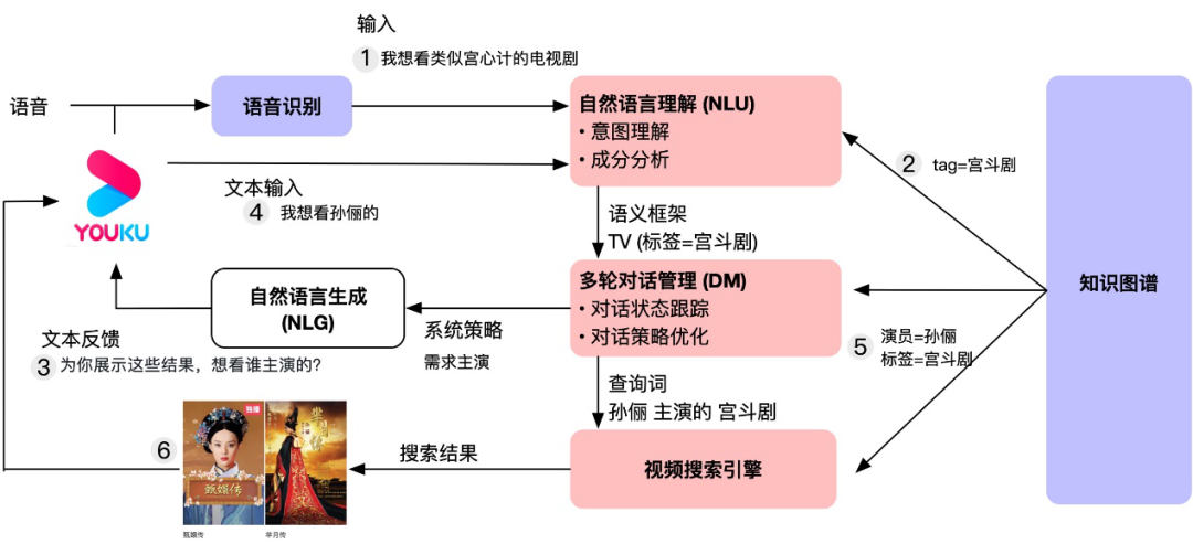 用户说“我想看类似宫心计的电视剧”,系统通过语音识别(ASR)和自然语言理解(NLU)技术理解分析用户想看‘宫斗剧’,通过检索反馈给用户‘宫斗剧’相关电视剧,并通过自然语言生成(NLG)技术主动和用户作进一步的交互,得到用户想看‘孙俪’主演的需求后,系统基于多轮对话管理(DM)技术将前后两轮的用户综合理解,向搜索引擎发起再次检索实现多轮交互。