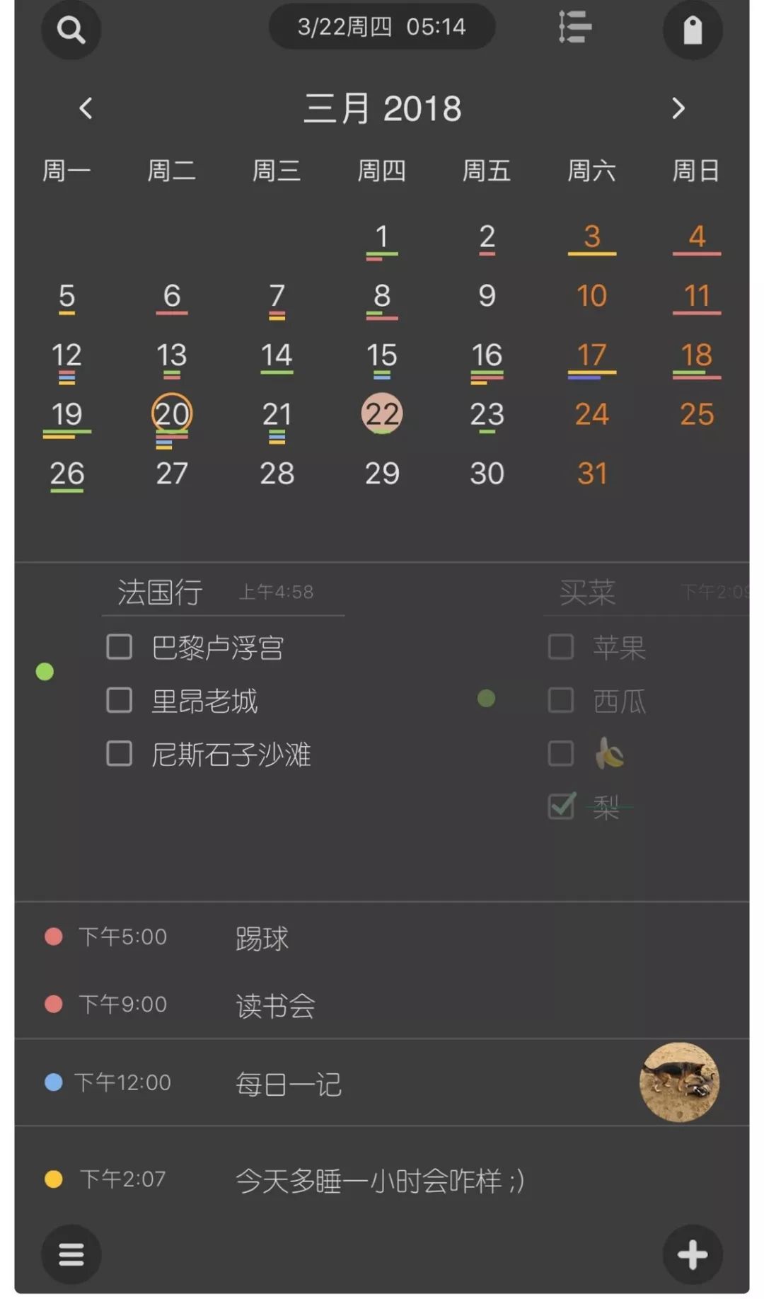 而当我们开启日历视图,就可以一眼看出每天有多少各个类型的笔记——工作、学习、娱乐,清清楚楚,明明白白。