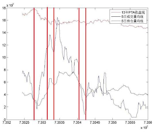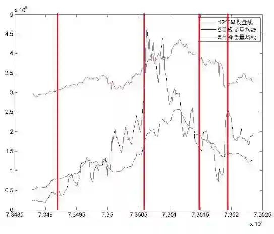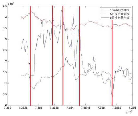 根据图2,在第一根竖线位置时,成交量和持仓量明显下跌,价格由升势变为跌势,价格波动率大。在第二根竖线位置时,成交量和持仓量都急剧上升,此时价格顺应原趋势下跌。在第三根竖线位置时成交量和持仓量同时下降,价格曲线由升变降,波动大。在第四根竖线位置时,成交量和持仓量稳步下跌,价格由升至降发生变动,波动大。在第五根竖线位置时成交量和持仓量一起下跌,价格趋势由降变升即波动大。