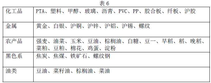 根据表1 至表4 中各指标的数据信息,本文利用RSR 综合排序法对四个指标的结果得出各品种排名。考虑到不同品种的上市时间不同,因此,本轮筛选过滤2013 年新上市品种国债期货、动力煤、石油沥青、铁矿石、鸡蛋期货和粳稻期货,纤维板期货、胶合板期货,由于铁矿石在综合排序中排第5 位,排名靠前,所以将铁矿石留下,并选取前二十名,再将不满足资金流向的农产品筛选掉,仅留下白银、橡胶、玻璃、沪深300 指数股指期货、焦煤、燃料油、线材、LLDPE、PTA、黄金和螺纹钢品种。经过上述筛选后,根据所出的品种以及按照A 题附件中板块说明中的分类划分可得下表,