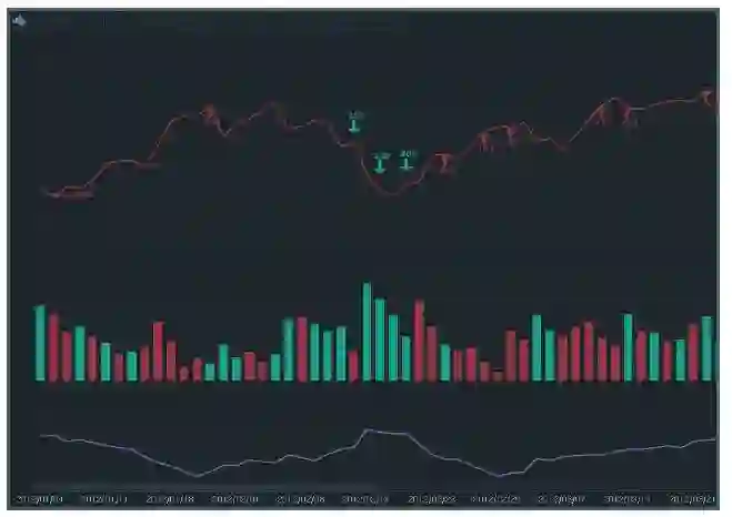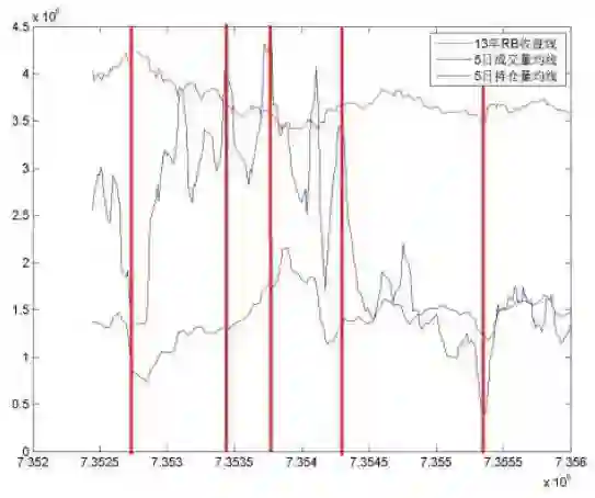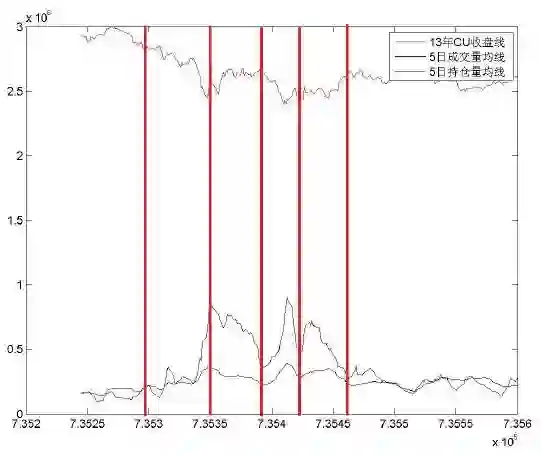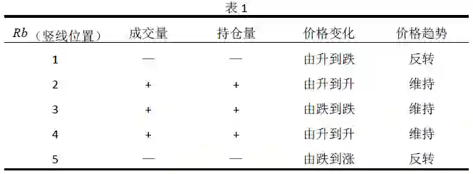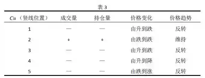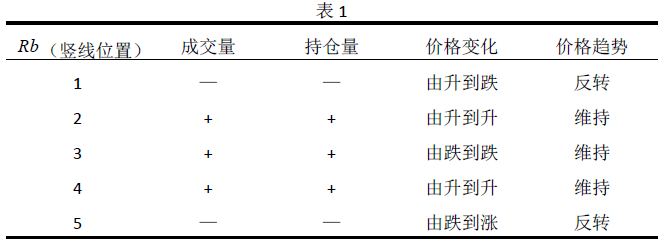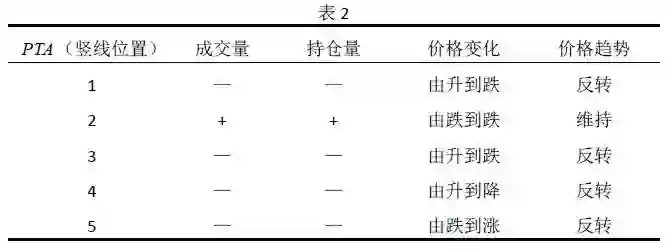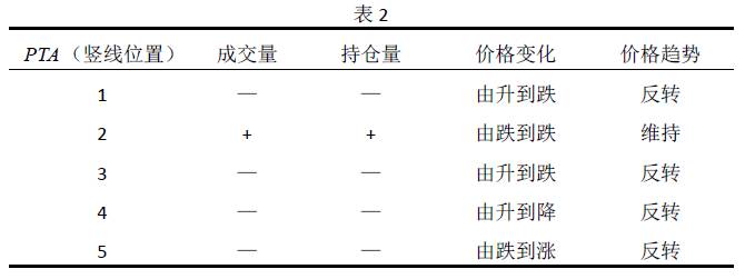 根据图1,在第一根竖线位置时,可看出成交量和持仓量明显下降,此时价格曲线由升势变为跌势,价格波动大。在第二根竖线位置时,成交量及持仓量稳步上升,此时价格维持跌势不变,价格波动率小。在第三根竖线位置时,成交量及持仓量剧烈上升,价格保持跌势不变,价格波动小。在第四根竖线位置时,成交量与持仓量为上升状态,价格稳步上升,其波动率小。在第五根竖线位置时,成交量及持仓量逐步下跌,而价格由跌势变为涨势逆转。