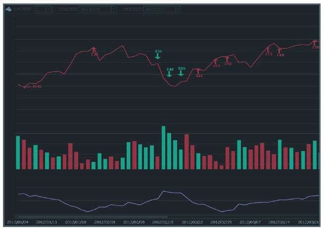 海龟策略为在择时入场上,设计一个唐奇安通道,当收盘价突破50 个交易日里胡盘中最高价,即上轨,发出多头信号;当收盘价低于20 个交易日里的盘中最低价,即突破下轨,为空头信号。该策略在择时入场十分灵敏。得出结果如图5 所示,本文使用2012-2013 年螺纹钢K 线数据,运用量化社区中的海归策略对资金流向进行分析,