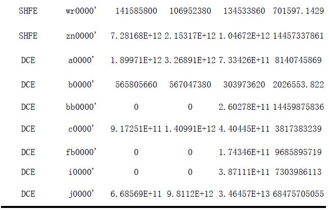 在股票市场中,资金流向(Money Flow)是一个可以反映市场中某个股票的超额需求或供给的标准的技术指标,由于每个买单会有一个对应的卖单,于是真实的资金流向无法确切计算,只能通过其他替代方法来刻画资金的流入和流出,通过高频数据分析,当股票价格上涨时,确定为资金流入,相反,当价格下跌时,确定为资金流出,但是由于期货市场中有做空机制,只根据价格的变化不一定能刻画出资金流入或流出,于是,我们需要对期货市场中价格与成交量、持仓量的关系进行研究。通过对国内外量价关系的文献研究,国外Clark(1973)提出混合分布假设认为当市场信息发生变动时价格和成交量同时对该信息作出反应,成交量的信息有助于对价格波动的预测,Bessembinder和Seguin对期货市场研究表示,成交量和持仓量对价格波动均有显著影响,华仁海和仲伟俊使用GARCH 模型验证出成交量与绝对价格波动正相关,但不同期货种类影响不同[2],白东辉和杨栓军使用GARCH 模型和ECM 模型对我国上海铜期货价格成交量与持仓量之间的动态关系进行研究,并利用协整检验和,得到相同结论,即铜期货价格与成交量、持仓量之间存在显著的相关关系。当同时对期货价格施加成交量和持仓量这两个影响因素时,对于铜期货其持仓量和价格波动之间的关系表现为负相关,即持仓量和价格同时增长时,价格波动较小,反之,价格波动较大[3],本文运用实例就不同标的的情况进行实例分析。
