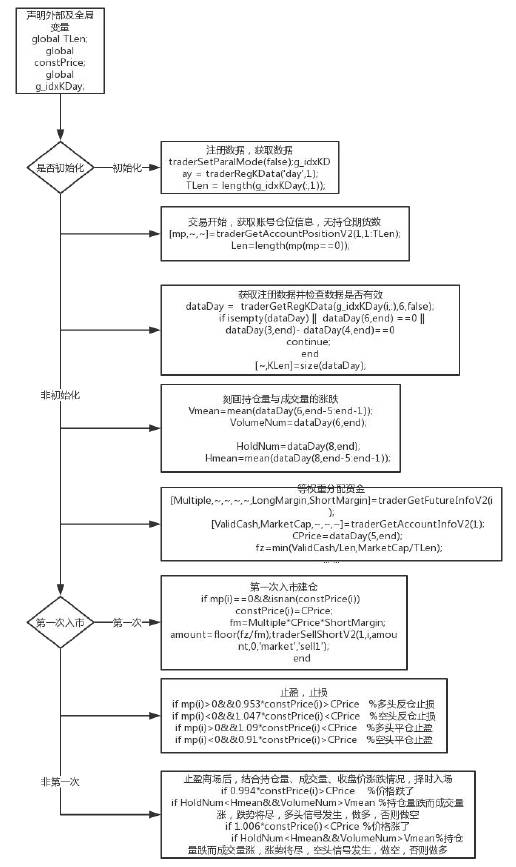 若非第一次入市,当价格按离场后记录的价格为基准涨到一定值时,初步判定做多信号,通过资金流向规律对应情况验证做多信号的准确性,当成交量上升,持仓量下降时,意味原来的趋势将尽,视为反转趋势,则反手操作,其余情况则表示支持此趋势继续操作;当价格按离场后记录的价格为基准降时,初步判定做空信号,同样遇到成交量上升,持仓量下降时判定反转,其余按照原趋势入场做空或做多。