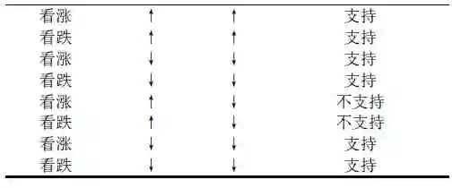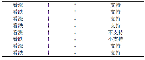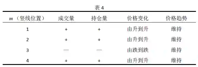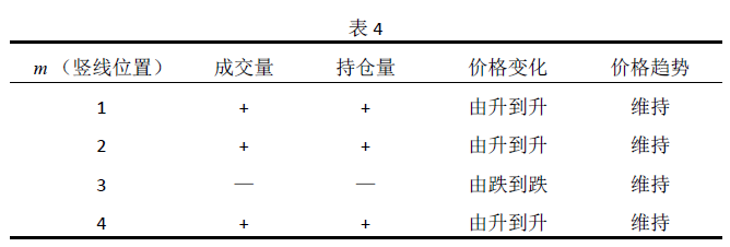 由以上几处分析结果如表所示(以下成交量及持仓量上升由+表示,下降由—表示),