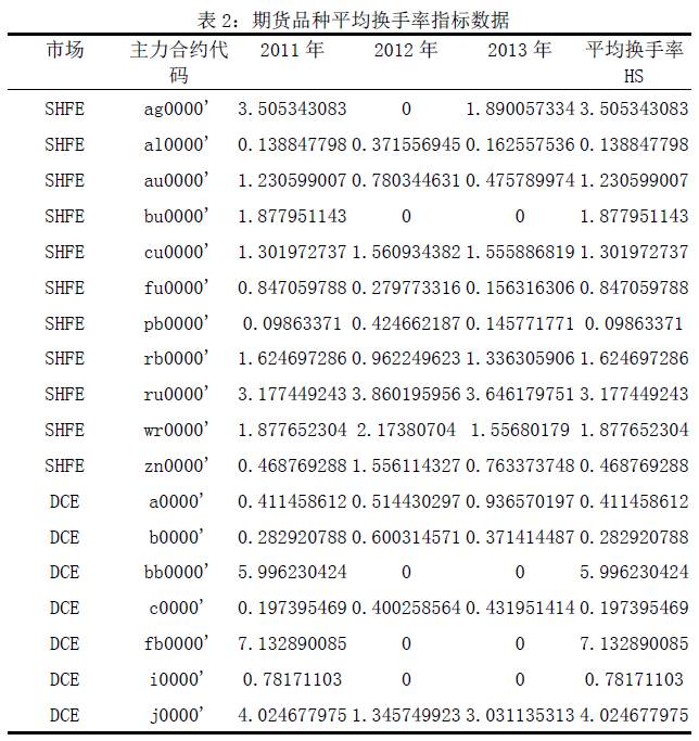 由于每个期货品种的主力合约已做成统一连续的标准合约,并且其主力合约即为当日持仓量最大的合约,因此,本文初步选取上海期货交易所、郑州商品交易所、大连商品交易所、中国金融期货交易所四大交易所2011 年1 月1 日-2013 年12月31 日54 个品种的主力合约。