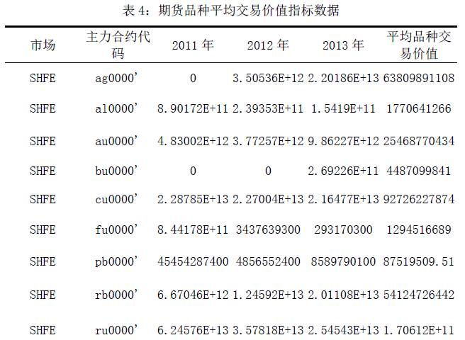 1)将分别计算出每年所有主力合约的价格波动性、活跃度、成交量,交易价值四个指标值,对各年所得的结果进行求和再除以各交易品种对应的交易日数量T,得出所有指标值的平均值。