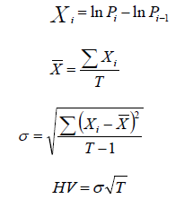 首先获取2011-2013 年四个交易所不同品种的各交易日T 以及对应收盘价,通过计算出每个交易日收盘价Pi 的对数值与前一交易日的收盘价Pi-1 的对数值之差Xi.。并且得出这些对数值的标准值 ,再乘上一年中包含的各个品种对应交易日数量T 的平方根,得到价格波动率HV 。具体公式如下: