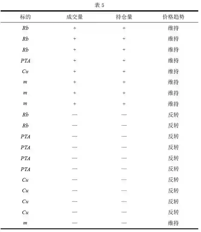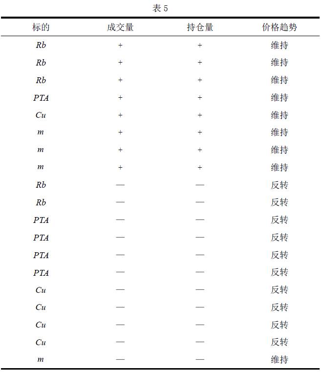根据以上不同标的分析,我们发现Rb 、PTA 、Cu 、m 的成交量、持仓量及其价格趋势如表5 所示,