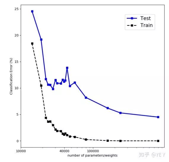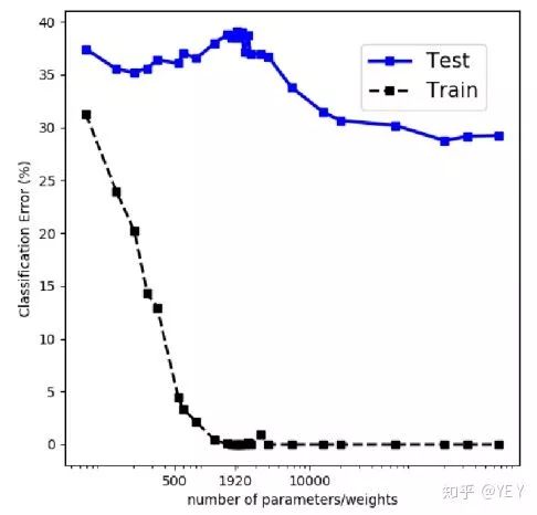 这个曲线可能看上去过于随意了些,后续有个工作把这个现象和颗粒物质的阻塞现象联系了起来,里面的实验结果看上去更加明显一些。虽然个人感觉这个现象到了CNN上有可能站不住脚(如果有哪位大佬试了,或者发现有人试了恳请留言告知),但是至少说明了一个其实很显然的结论:用传统观点看待神经网络的过参数化是行不通的。