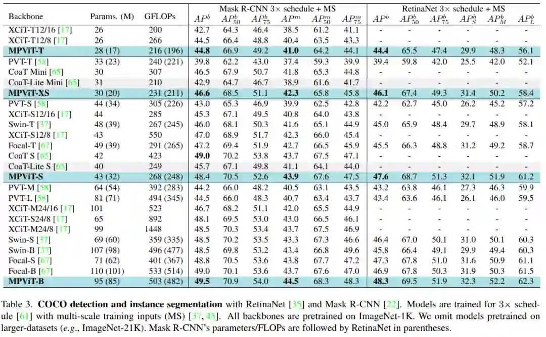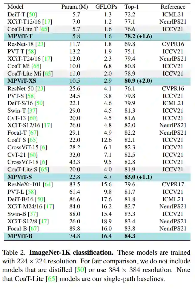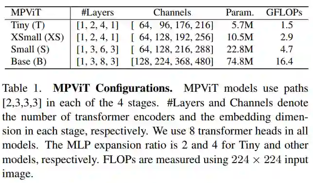 作者还发现,虽然 triple-path和双路径在ImageNet分类中产生相似的精度,但 triple-path模型在密集预测任务中表现出更好的性能。因此,建立了基于 triple-path结构的MPViT模型。MPViT的详细情况见表1。