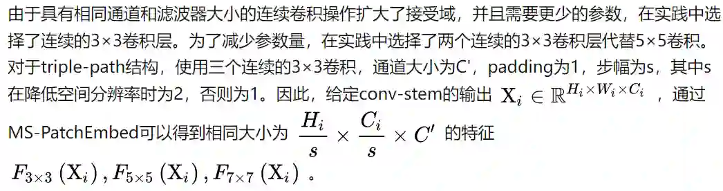 从stage 2到stage 5,作者在每个阶段对所提出的Multi-scale Patch Embedding(MS-PatchEmbed)和Multi-path Transformer(MP-Transformer)块进行堆叠。