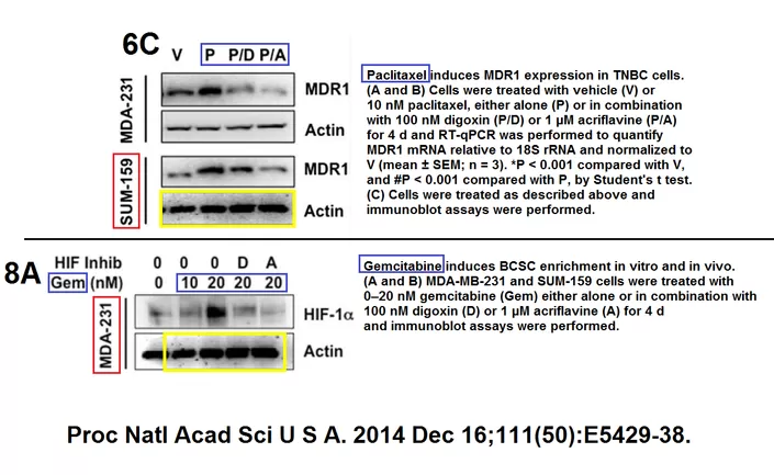 「图3E的Pac + IL8 nAb面板和图5F的车辆面板之间可能存在重复数据。图4的HIF-1α面板的第一和第二通道之间可能存在拼接。图6C的完整SUM-159肌动蛋白面板与图8A的MDA-231肌动蛋白面板的通道2-5之间可能存在重复的数据。图S5A的Digoxin和Gemcitabine+Digoxin面板之间可能存在重复数据。图S6C和S6E的肌动蛋白面板之间可能存在重复数据。」