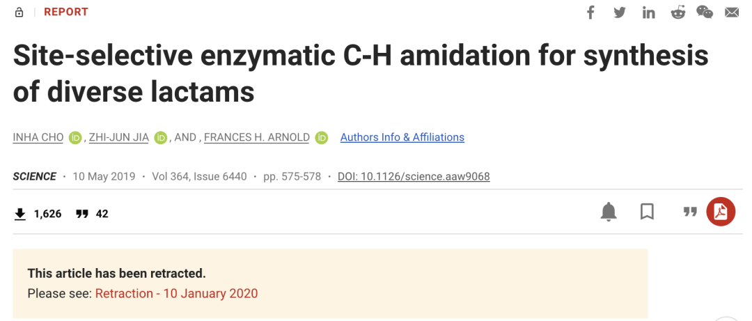 比如,2018年诺贝尔化学奖得主Frances Arnold在无法重复推出实验结果后,宣布撤回自己于2019年5月发表在 Science上的论文Site-selective enzymatic C‒H amidation for synthesis of diverse lactams。