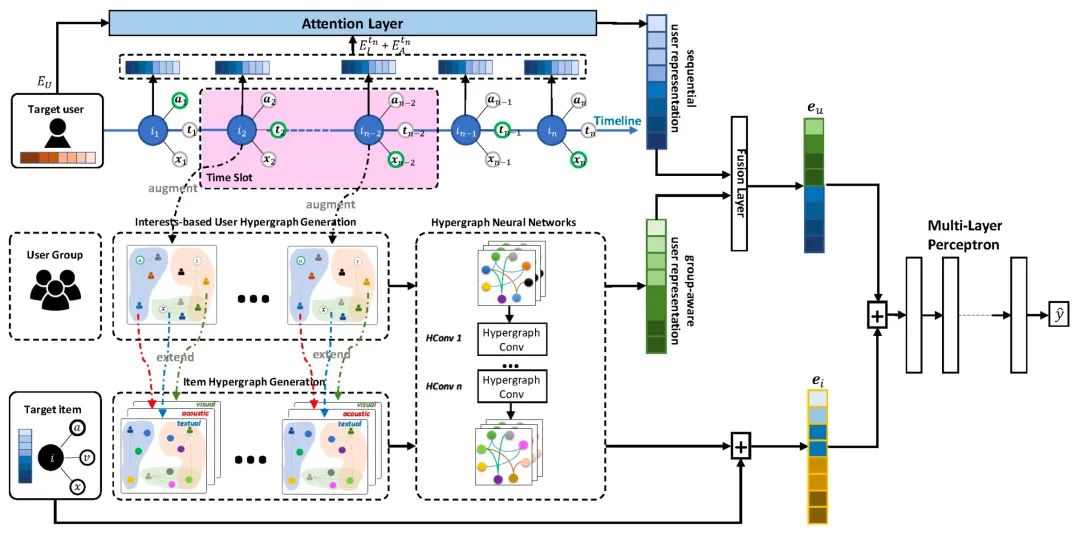 基于时序的用户行为注意力模块旨在根据用户的物品交互序列,通过用户、物品和多模态类别的表示,结合 Transformer 的自注意力机制来学习交互序列内部的关系。基于兴趣的用户超图生成模块,商品超图构造模块是分别根据用户行为以及物品的多模态联系,构建出对应的超图,再在这些超图上使用 HGCN 来学习用户和物品的表征。最后再将基于时序的用户行为表示和基于超图的用户表示进行融合,最终通过MLP层得到最终的 CTR 预测值。