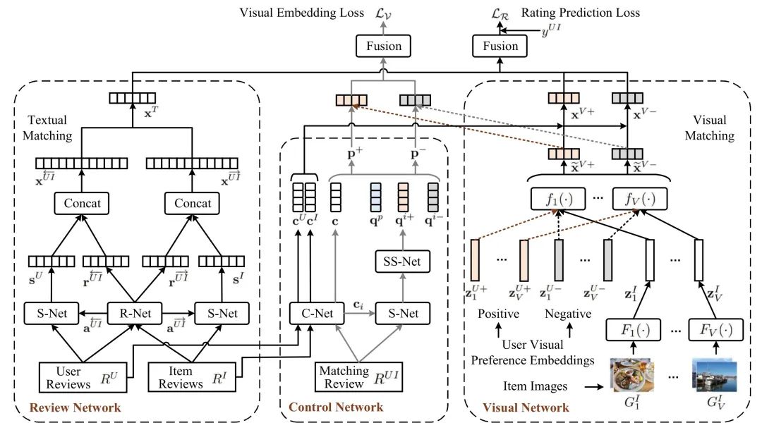 模型图如上所示,输入包括用户 的历史评论 ,物品 的历史评论 ,用户 对物品 的评论 (仅在训练时使用) 以及物品 在 个方面的图片集 。训练任务包括 Rating Prediction 以及用户视觉偏好损失。