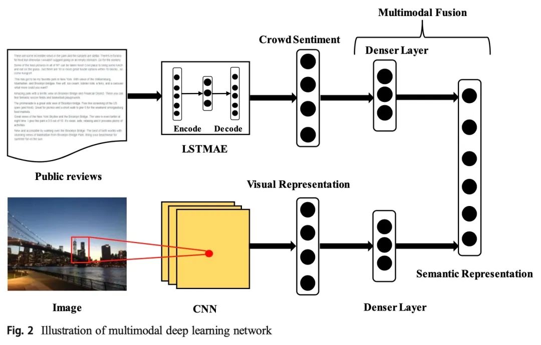 而对于多模态信息,该模型分别对文本和图像使用了 LSTMAE 以及 VGG-16 来得到对应的表示,然后通过 fusion 网络进行融合,从而得到地点多模态的语义信息。这里的 fusion 网络就是分别对文本和图像的表示通过一个线性层,然后将两者拼接起来再通过一个线性层进行融合。